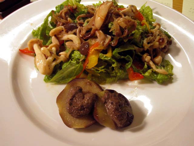 キノコと松の実のサラダに前菜はナスのグリルにオリーブで作ったソースを乗せて。 サラダも具沢山なので結構食べ応えがあります。お出しした時のお客様の歓声が嬉しい一品。これにフォカッチャ・パスタかピッツァを食べたらもーお腹はいっぱいのハズ☆(食後の飲み物も付きますヨ)