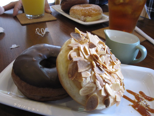 この日いただいたものは、チョコドーナツとアーモンドスライスのやつと、中にクリームチーズが入ってるシュガードーナツ。 と、ラスク☆(ありがとうございました。おいしかったですー♪ もちろん商品ですよね?あれは。袋詰めとかしてますよね?してなかったらしてほしいですわ。)