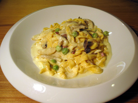 先日立ち寄った際に「まぁ一杯どうぞ。」とまるでお茶を出すように出していただいた一品。「キノコとグリーンピースのクリームソースのタリアテッレ」