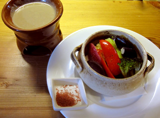 アロマキャンドルのように火を灯されて、くつくつしているバーニャカウダーソースに