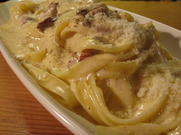 チーズをたっぷり使った濃厚なカルボナーラソースの一品。
